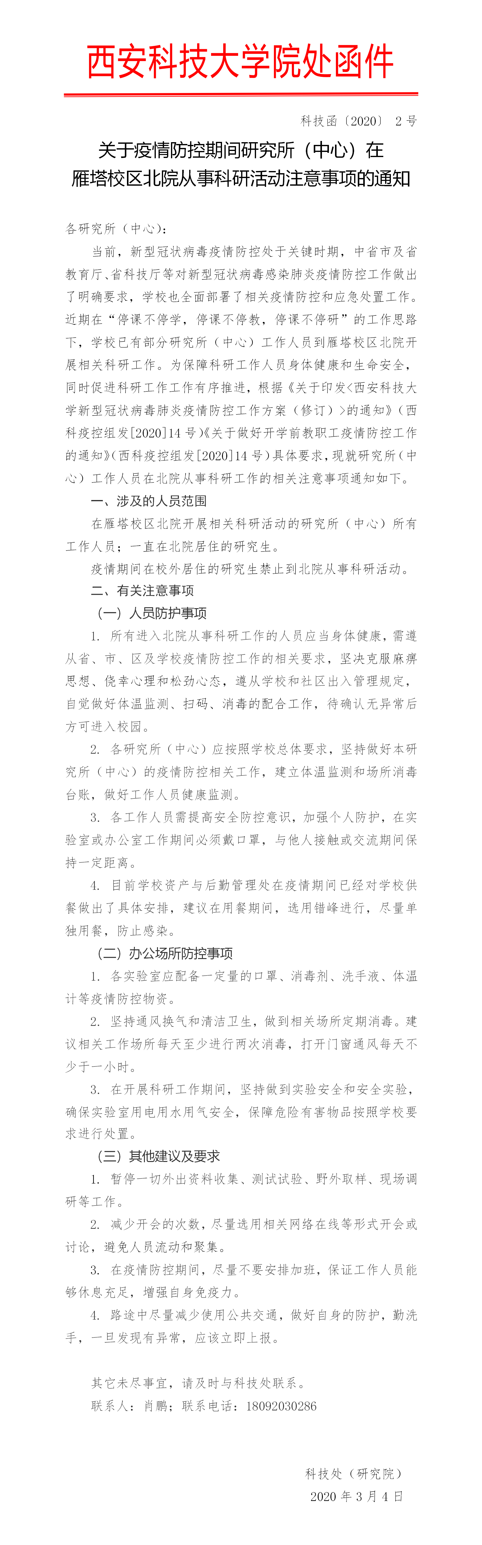 关于疫情防控期间研究所(中心)在雁塔校区北院从事科研活动注意事项的通知