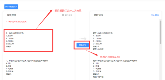 3)上传成功后,在页面左侧编辑题目的区域可以进行编辑修改,如格式问题、空白行删除等,编辑完成后点击“重新识别”,系统会根据所编辑的内容进行识别调整。