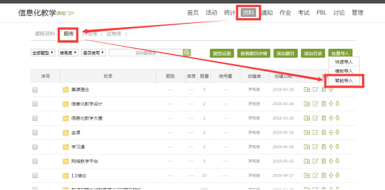 1)访问学校平台,账号密码登录之后,进入课程资料区,选择题库-批量导入-智能导入。